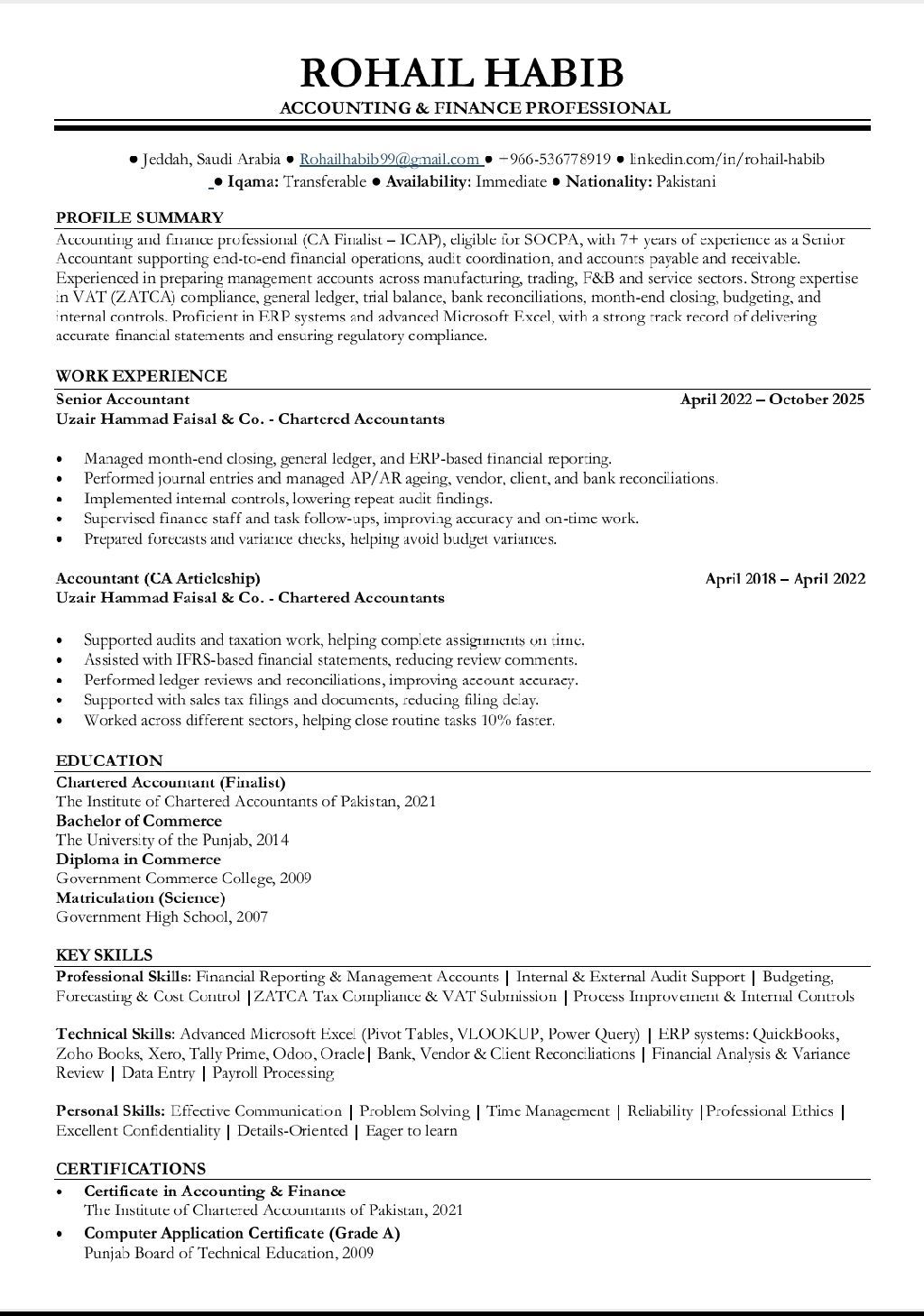 Accounting and finance professional (CA Finalist - ICAP) eligible for SOCPA, with 7 + years of experience as a Senior Accountant supporting end - to - end financial operations, audit coordination, and accounts payable and receivable. Experienced in preparing management accounts across manufacturing, trading, and service sectors. Strong expertise in VAT (ZATCA) compliance, general ledger, trial balanc