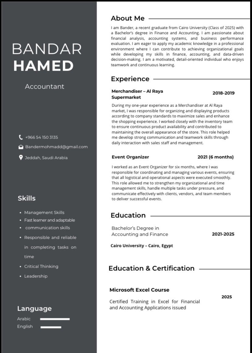 خريج محاسبة مالية من جامعة القاهرة، ابحث عن فرصة عمل في مجال المحاسبة أو المالية. لدي معرفة جيدة بالمبادئ المحاسبية واعداد التقارير المالية، وأسعى لتطوير مهاراتي واكتساب الخبرة العملية في بيئة عمل احترافية