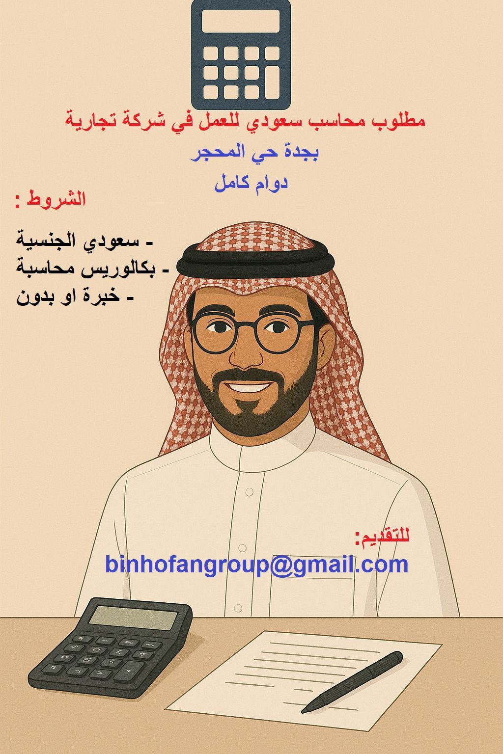 للسعوديين فقط - مطلوب محاسب سعودي - جدة حي المحجر - الشروط بكالوريوس محاسب خبرة سنة - المزايا - تسجيل تأمينات - تأمين طبي - ومزايا أخرى - للتقديم أكتب اسم الوظيفة وارفق السيرة الذاتية وسنتواصل معك اذا توافقت فقط الشروط تواصل واتساب أو بريد الكتروني