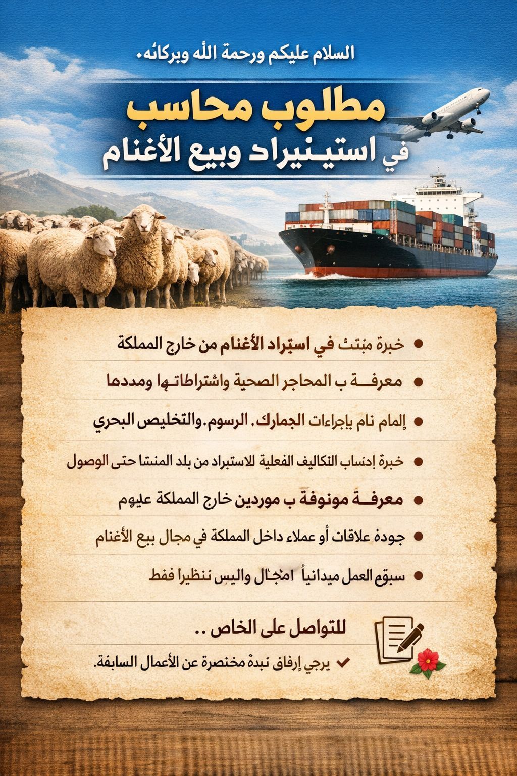 مطلوب محاسب متخصص في استيراد وبيع الأغنام، لديه خبرة عملية فعلية في الاستيراد من خارج المملكة، ومعرفة كاملة ب المحاجر الصحية، اجراءات الجمارك، الرسوم، التخليص، والشحن. يشترط الالمام بحساب التكاليف من بلد المنشأ حتى الوصول، ومعرفة موردين موثوقين خارج المملكة، ويفضل وجود قاعدة عملاء داخل المملكة. يشترط الأمانة، الدقة، وسبق العمل الميداني في هذا المجال التواصل خاص لمن تنطبق عليه الشروط جدة / حي الحمرا
