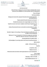 اعلان وظيفي تعلن شركة اركان العمران للمنتجات الإسمنتية والخرسانة الجاهزة عن توفر وظيفة شاغرة بمسمى مدير مالي المهام الرئيسية إدارة العمليات المالية والمحاسبية للشركة بكفاءة عالية. اعداد القوائم والتقارير المالية الدورية. التخطيط المالي وإدارة الميزانيات والتدفقات النقدية. الاشراف على الحسابات والالتزام بالأنظمة موقع العمل جدة الحي الخمرة المتطلبات بكالوريوس
