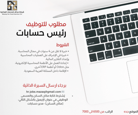 نبحث عن موظفة سعودية بدوام كامل لديها خبرة في المحاسبة للعمل في شركة تجهيزات مطاعم في جدة شارع التحلية ويحدد الراتب بعد المقابله