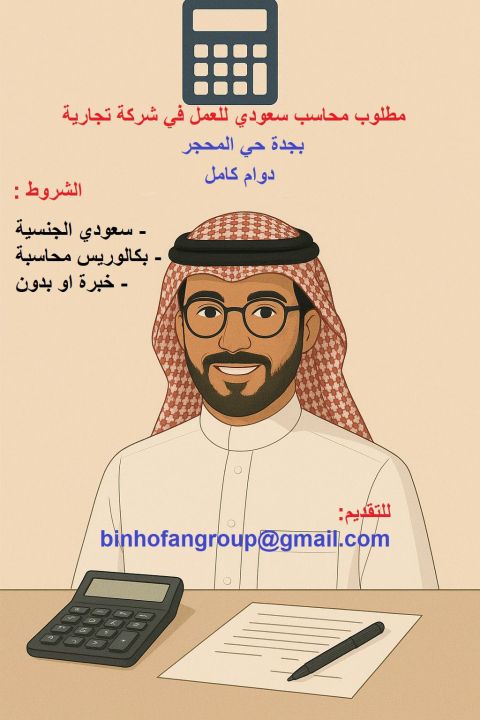 مطلوب محاسب مقاولات دوام كامل يوم في الأسبوع اثنين وخميس في جدة حي البساتين