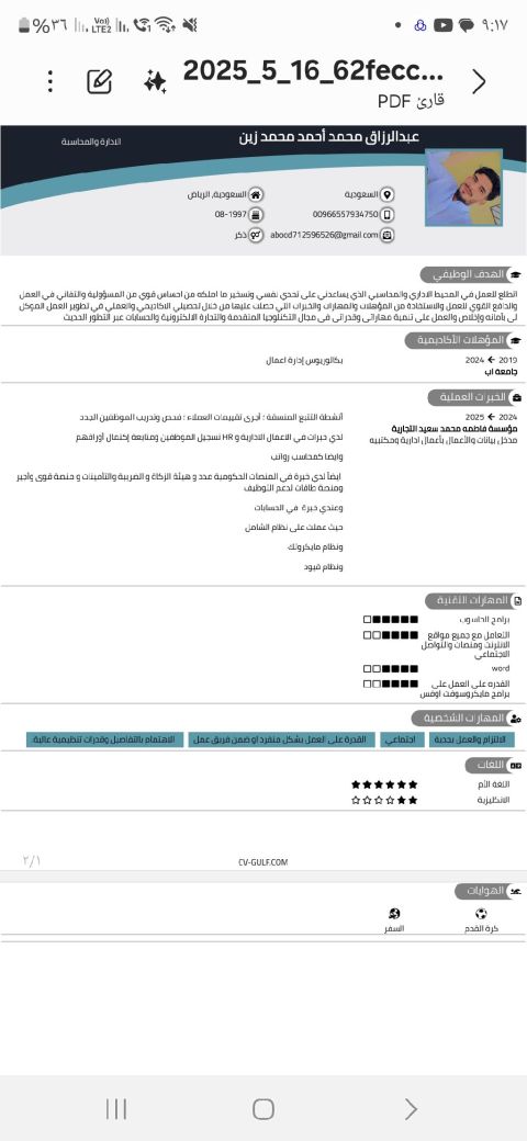 موظف اداري في أشهر البراندات السعودية بخبرة في تنظيم المهام، تنسيق الأعمال، وإدارة العمليات اليومية باحترافية وكفاءة. أتميز بالدقة في انجاز الأعمال مهارات تواصل عالية القدرة على حل المشكلات بسرعة تنظيم الوقت وتحقيق الأهداف حاصل على شهادة بكالوريوس هندسة الحاسوب ودبلوم لغة الانجليزية