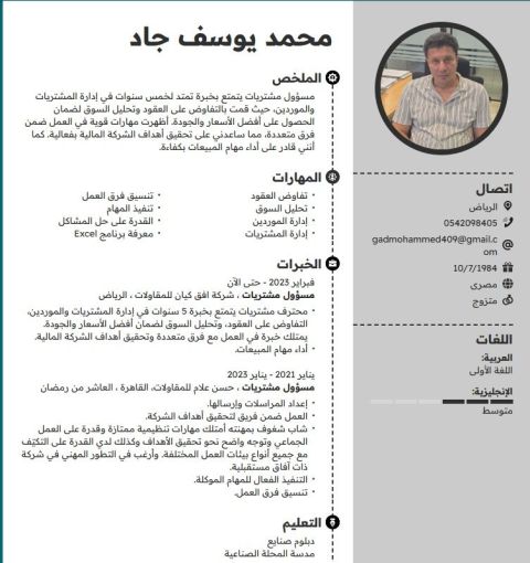 سوداني مقيم خبرة في الادارة والتخطيط الاستراتيجي وعمل السياسات وبناء الهيكل الاداري ومتابعه المبيعات وتقييم الأداء الفعلي ومؤشرات التحسن وربطها بالتشغيل العام ومتابعه المهام ودراسة السوق ووضع الاسترايجيات وتحديد نقاط والقوة والضعف أجيد كذلك القيام بالمهام الراقبيه والإشرافية المتعددة والتعامل مع الحاسب الآلي وقراءة وتحليل النتائج والتعامل مع حل المشكلات بخبرة 9 سنوات كما أجيد الانجليزية