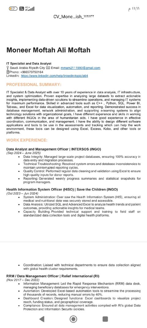 خبير اداري وتقني حاصل على ماجستير IT بخبرة تتجاوز 10 سنوات في إدارة العمليات والبيانات لدى منظمات دولية. امتلك مهارات قيادية وتنسيقية عالية، وقدرة مثبتة على اتمتة الأنظمة لتقليل الأخطاء بنسبة 40%. حاصل على تدريب PMP وخبير في إدارة المشاريع، الرقابة، والامتثال للسياسات العالمية. أتميز بمهارات تواصل احترافية باللغتين العربية والانجليزية لتعزيز كفاءة العمل الاداري