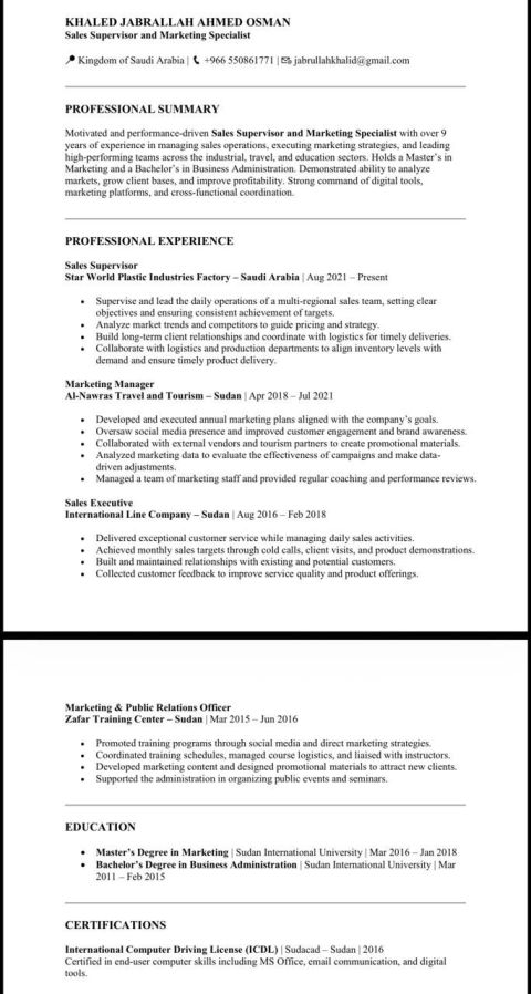 مصعب محمد عثمان سوداني الجنسية خبرة أكثر من 3 سنوات، في الادارة والاشراف والعمليات اللوجستية اجادة استخدام الحاسب الآلي والأوفيس والأكسيل امتلك شهادة خبرة وجيد في اللغة الانجليزية شخصية مرنة وأتحمل ضغط العمل مهما كان إقامة منتهية جاهزة للنقل الفوري