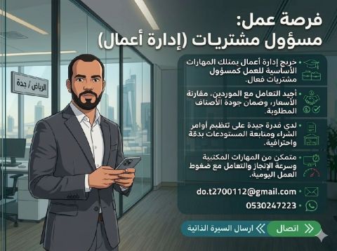 خريج إدارة أعمال يمتلك المهارات الأساسية للعمل كمسؤول مشتريات فعال. أجيد التعامل مع الموردين، مقارنة الأسعار، وضمان جودة الأصناف المطلوبة. لدي قدرة جيدة على تنظيم أوامر الشراء ومتابعة المستودعات بدقة واحترافية. متمكن من المهارات المكتبية وسرعة الانجاز والتعامل مع ضغوط العمل اليومية
