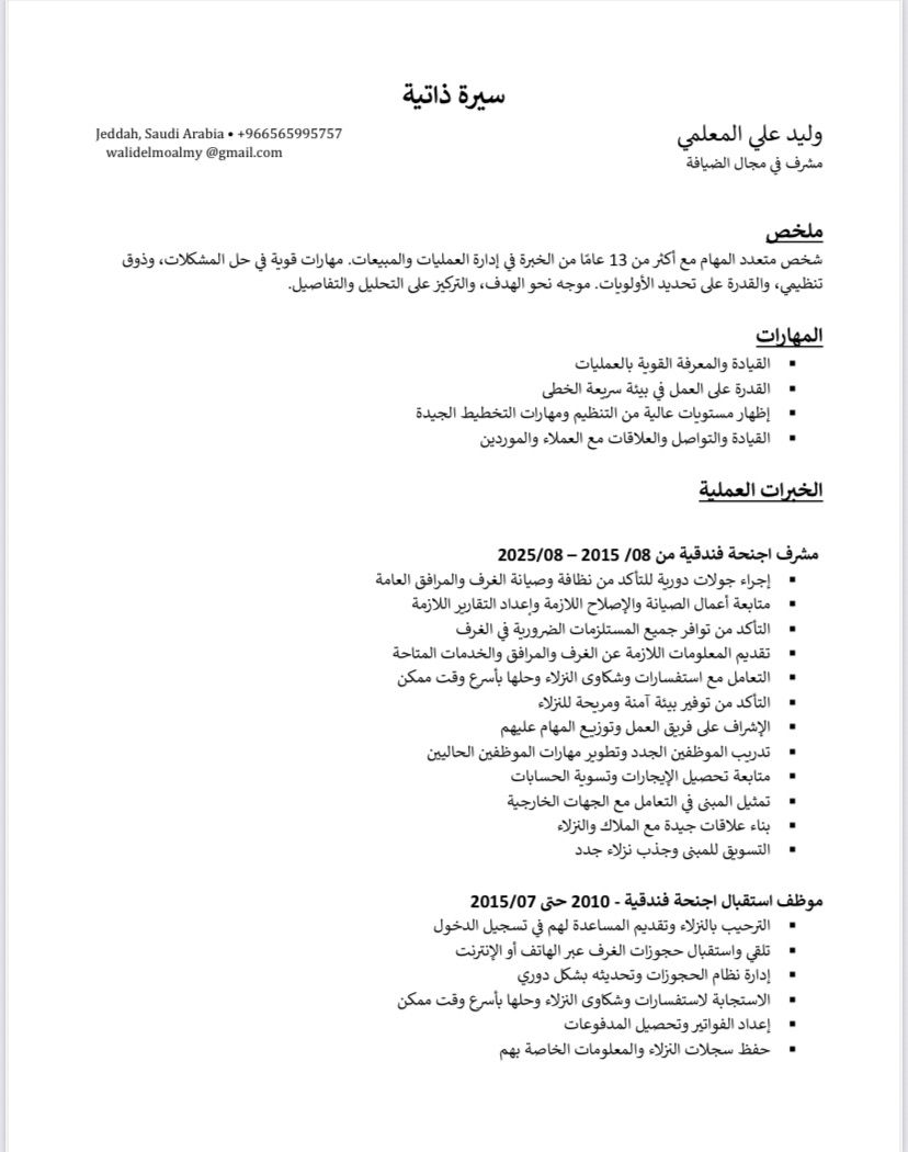 اعمل في مجال الفندقة منذ أكثر من 14 سنة، واتشرفت بالعمل في عدة فنادق مرموقة داخل مدينة جدة ومحافظة أملج. خلال مسيرتي اكتسبت خبرة قوية في تقديم خدمات عالية الجودة للنزلاء والعمل ضمن فريق احترافي والالتزام بأعلى معايير الضيافة أتميز بالدقة، والانضباط
