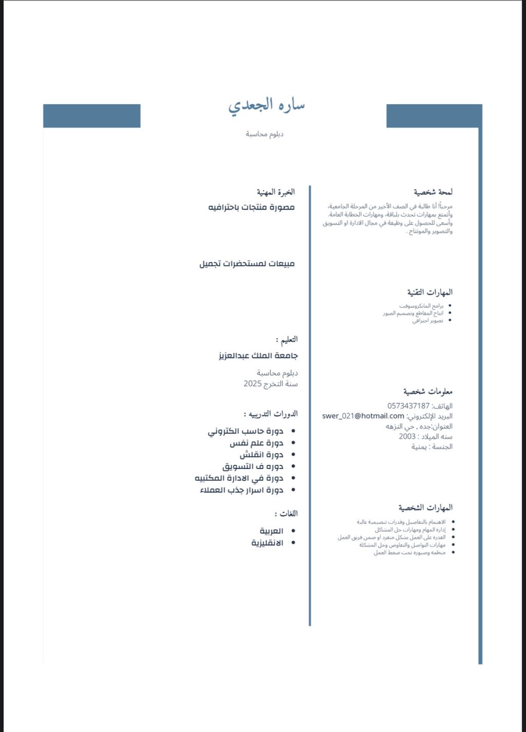 ساره الجعدي عمري 22 سنة ويمنية مواليد السعودية بإقامة سارية المفعول ابحث عن وظيفة مكتبية سكرتيرة مدخلة بيانات كاشير كول سنتر استقبال مساعدة ادارية ولدي خبرات مكتسبه اطمح في تطويرها أدرس في جامعة الملك عبدالعزيز في جدة في تخصص المحاسبة