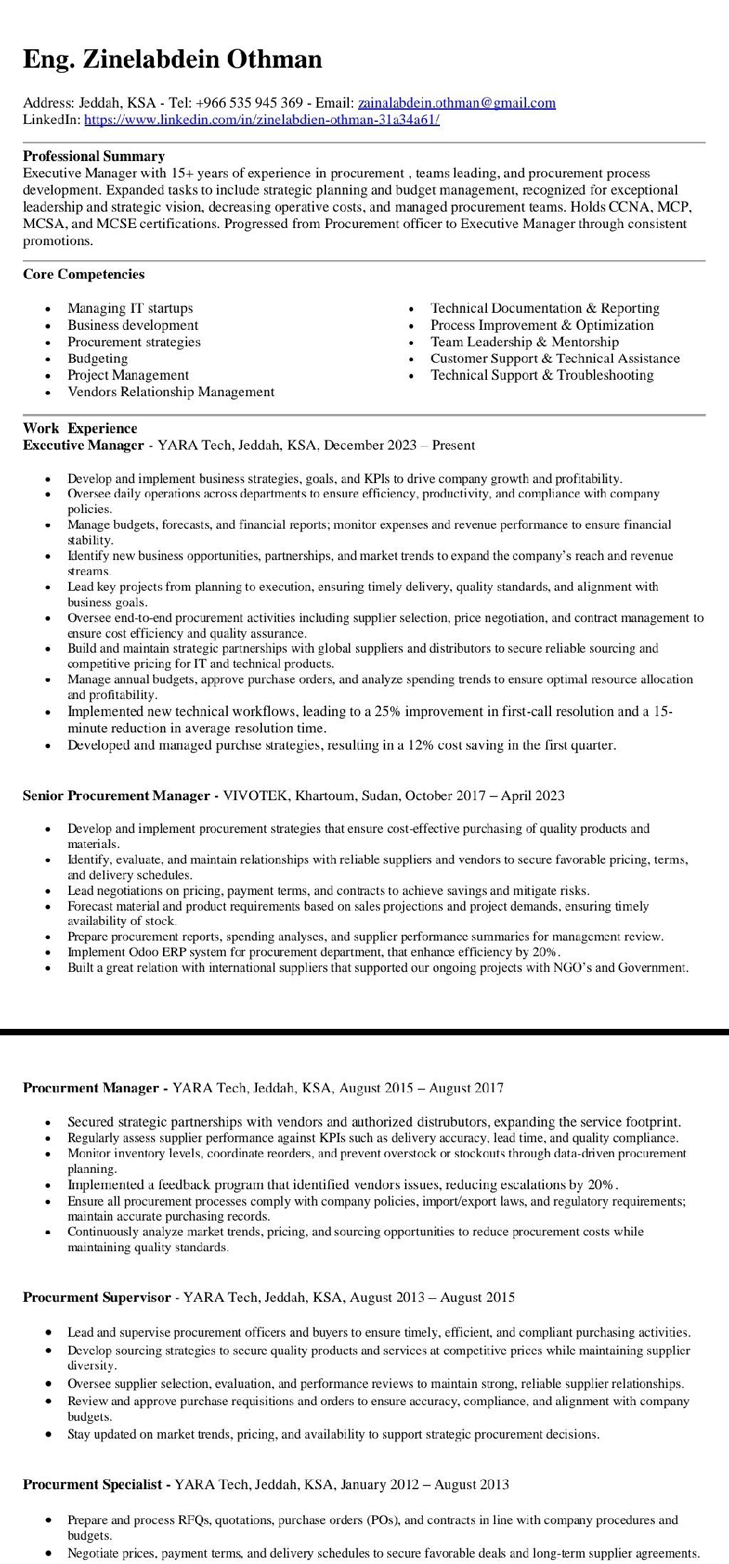 مدير مشتريات سوداني الجنسية، خبرة 16 سنة في السوق السعودي في عدد من المجالات التجارية المتنوعة من المشاريع التقنية والتجارة العامة. خبؤة في اعداد خطط المشتريات ووضع الهيكلة الاجرائية للمشتريات. بكالوريوس هندسة كهرباء الكترونية مع مرتبة الشرف. لغة انجليزية ممتازة. خبرة في الاستيراد من الخارج. موجود في جدة حاليا ولا مانع لدي من الانتقال لمدينة أخرى