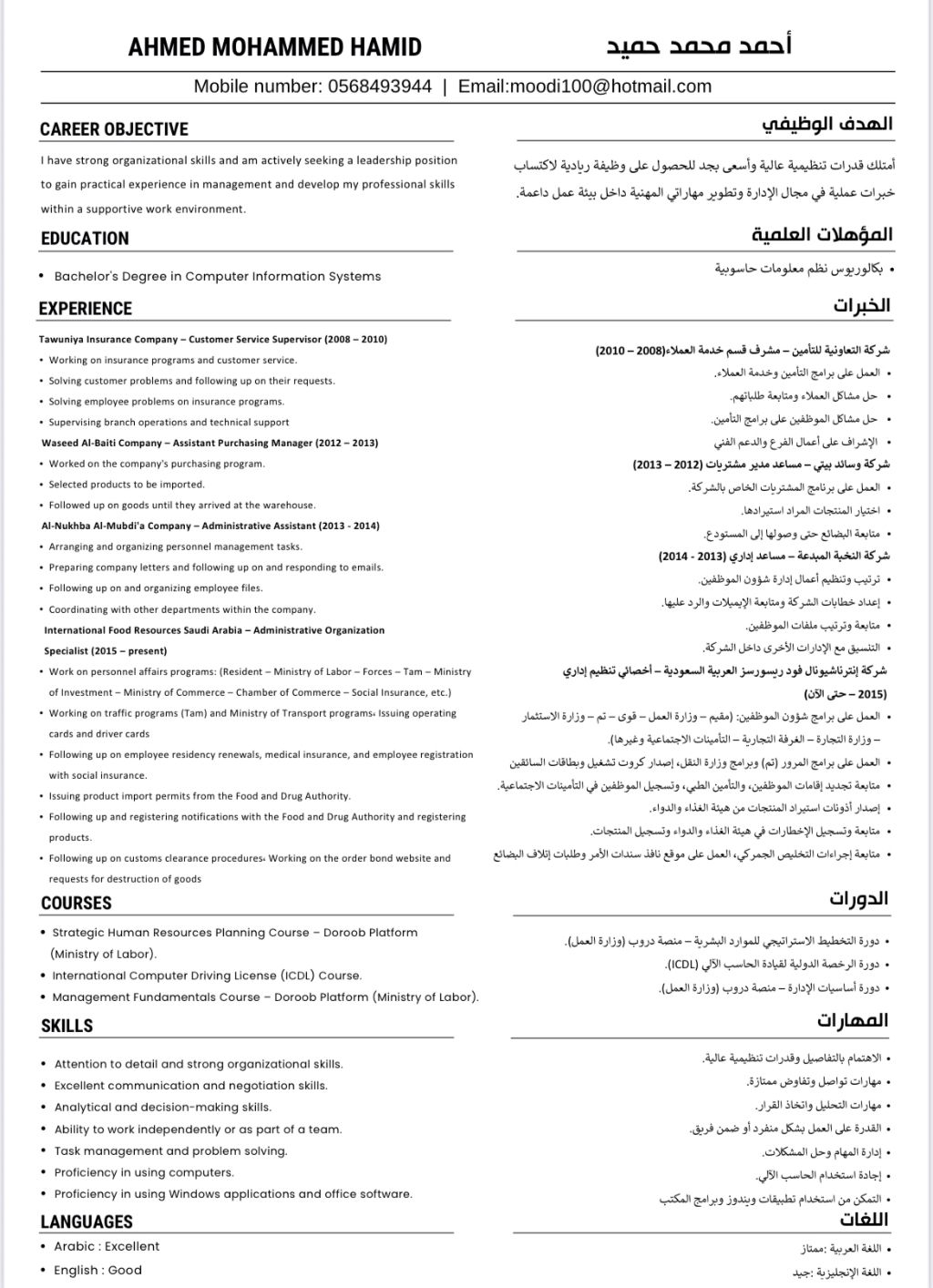 أخصائي تنظيم اداري وتنظيم أعمال الموارد البشرية (مقيم - قوى - التأمينات - مدد) وجميع المنصات الحكومية والاشراف على الأعمال الادارية المختلفة ومتابعة أعمال هيئة الغذاء والاستيراد والتصدير وأعمال السيارات التابعة لوزارة النقل (كروت تشغيل + بطاقات السائقين) يطلب عمل في مدينة جدة تواصل