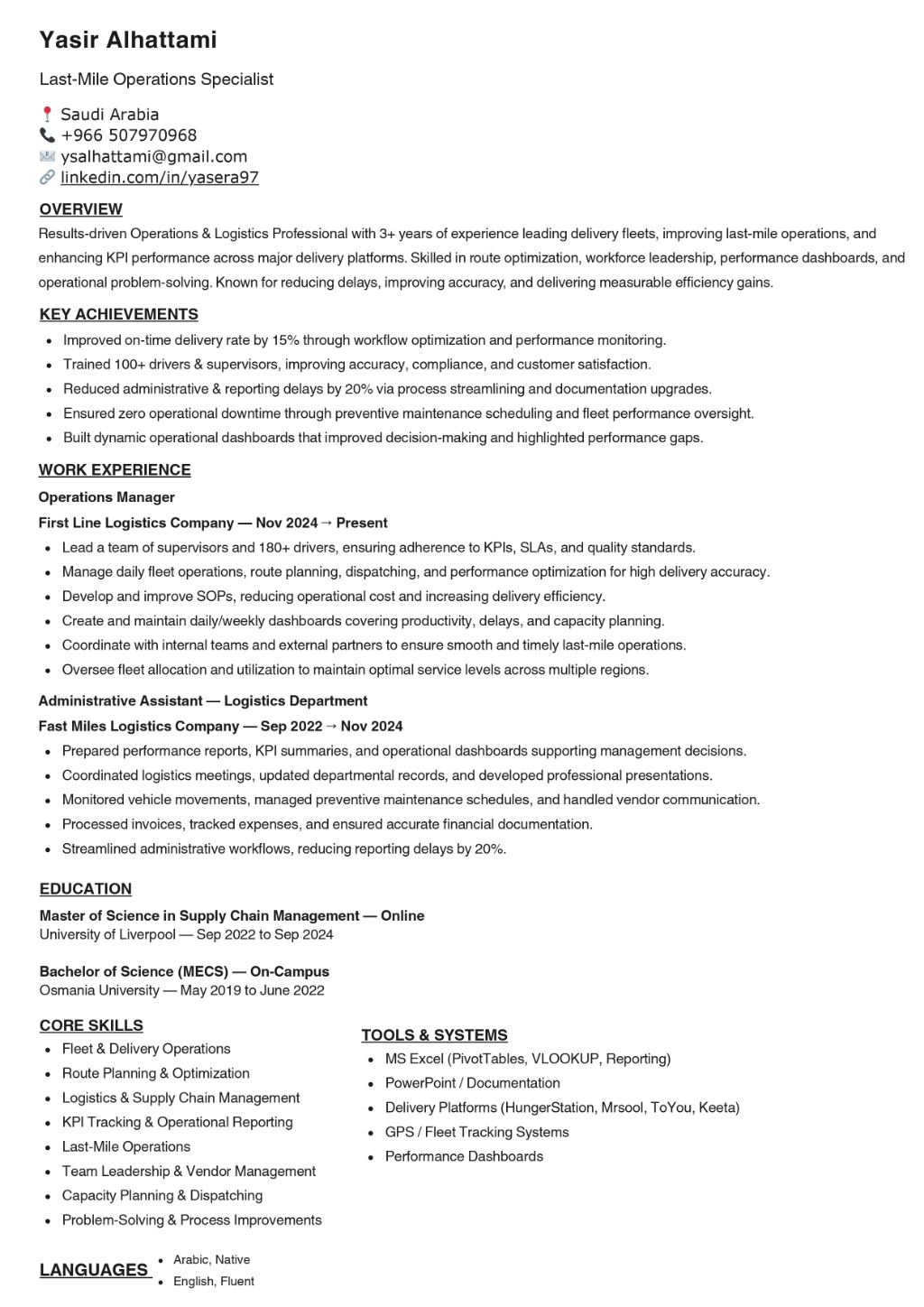 مشرف واداري ذو خبرة واسعة في المجال اللوجستي متخصص في إدارة وتشغيل تطبيقات التوصيل (كيتا هنقرستيشن تويوا مرسول) خبرة أكثر من 3 سنوات في إدارة المناديب والمشرفين وضمان سير العمليات بكفاءة عالية، ومتابعة مؤشرات الأداء وتحليلها لتحسين الانتاجية يفضل العمل في جدة مكة المدينة