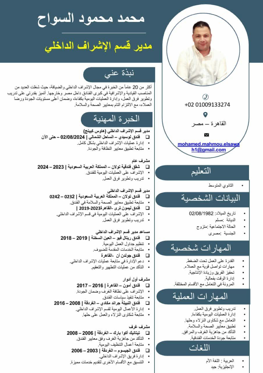 ابحث عن فرصة عمل مدير اشراف داخلي خبرة أكثر من 15 عام متواجد في مصر