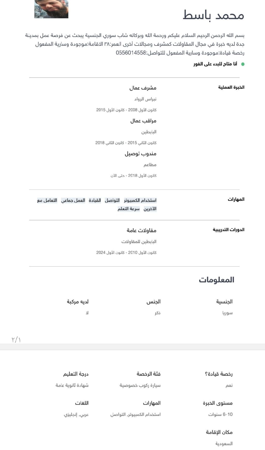 شاب سوري الجنسية يبحث عن فرصة عمل في مدينة جدة لديه خبرة في المقاولات والتوصيل