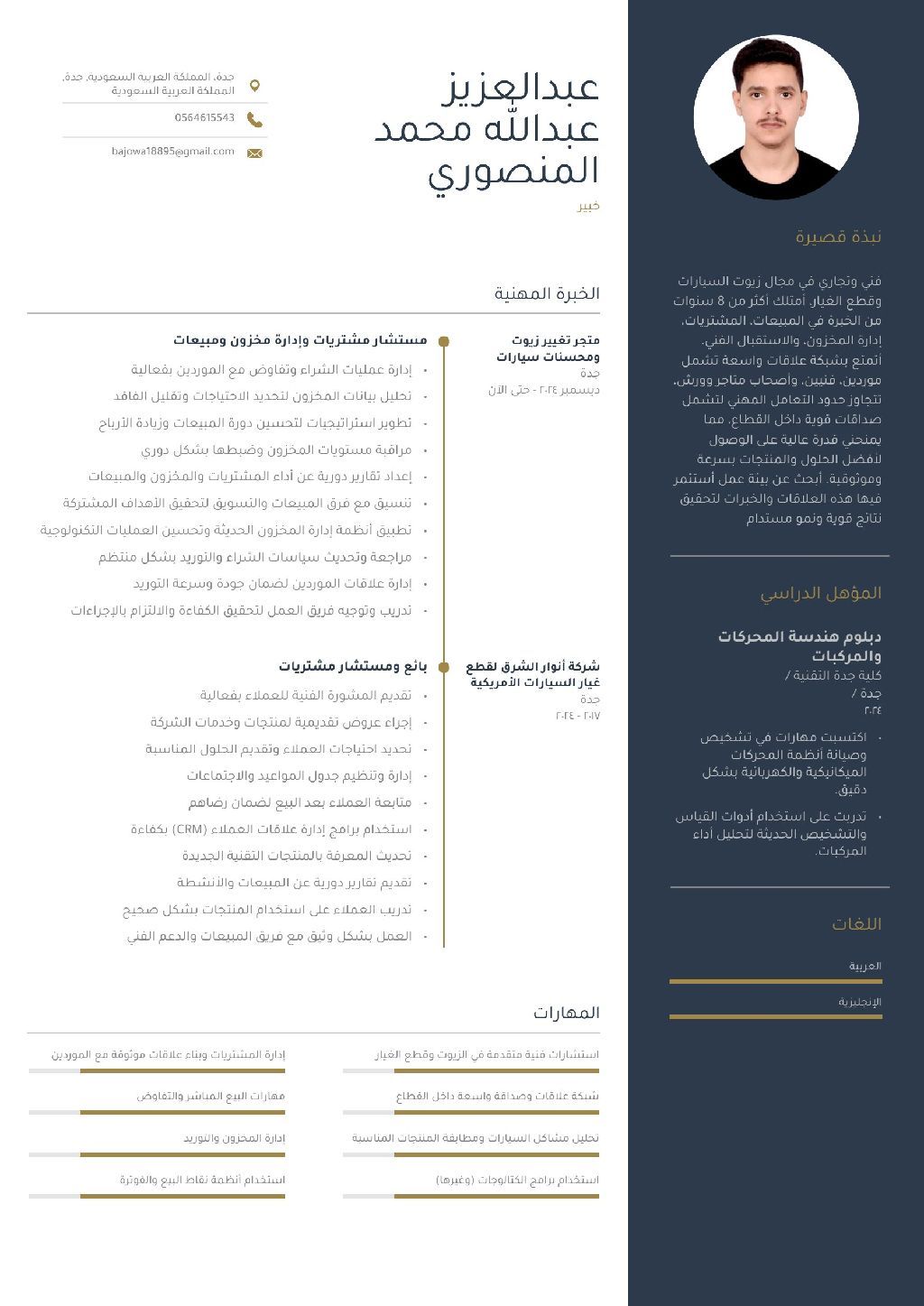 الاسم/ عبدالعزيز عبدالله محمد المنصوري الجنسية / اليمن العمر / 26 العنوان/ جدة، اللغات / عربي، انجليزي بمستوى ممتاز شهادة آيلتس من جنوب أفريقيا في اللغة الانجليزية بمستوى جيد جدا درسة دبلوم هندسة المحركات في كلية جدة لمدة سنتين تشخيص الأعطال. صيانة والقدرة على استخدام جهاز لانش للفحص ومعرفة الأكواد عملت لمدة 5 سنوات في شركة أنوار الشرق ومهندس استقبال مركز صيانة السيارات