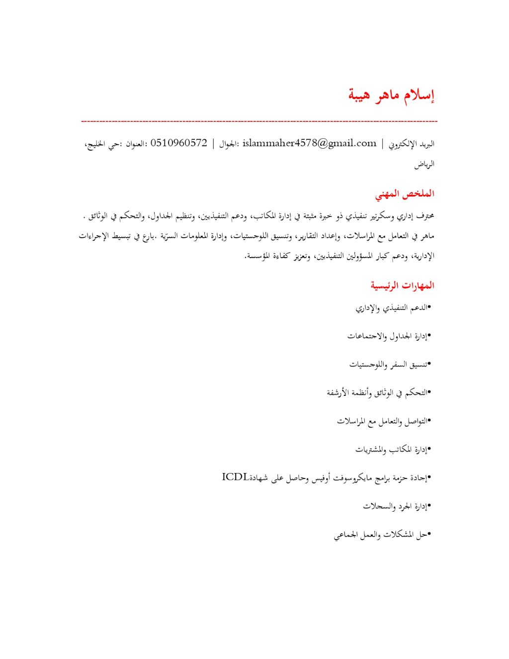 طلب وظيفة مساعد تنفيذي / منسق اداري ولوجستي البيانات الشخصية الاسم اسلام ماهر هيبة. الموقع الرياض - حي الخليج. الجوال 0510960572. البريد الألكتروني الملخص المهني أخصائي دعم اداري وتنفيذي بخبرة تزيد عن 5 سنوات في التنسيق العمليا تي، واللوجستيات، وإدارة المكاتب. امتلك مهارات مثبتة في دعم القيادات العليا، وإدارة الجداول الزمنية، وتحسين كفاءة العمل الاداري بنسبة 30%. أبرز الخبرات
