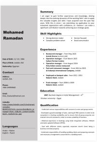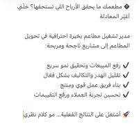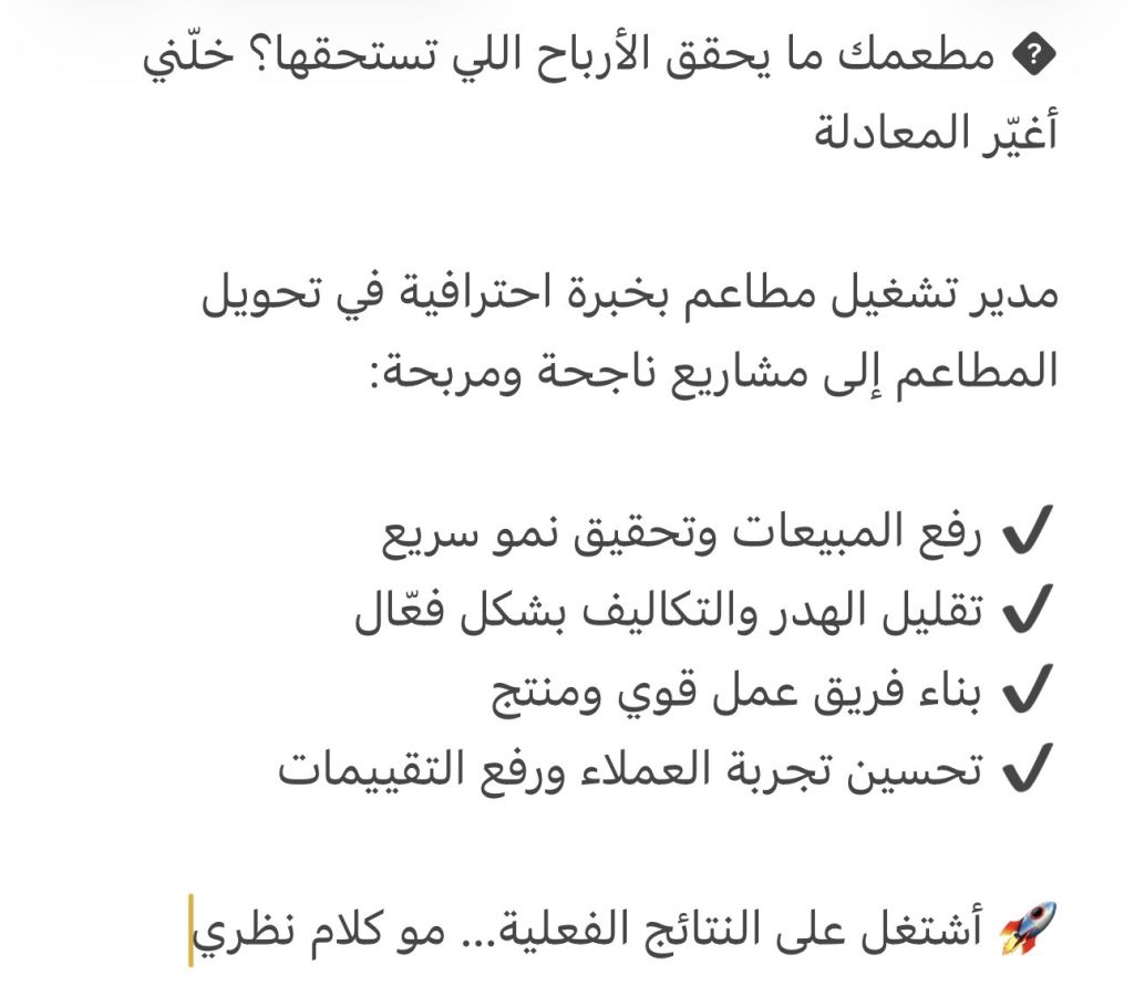 مدير تشغيل مطاعم بخبرة تتجاوز 15 سنة في تشغيل وإدارة المطاعم والفنادق، امتلك سجل نجاح مثبت في زيادة المبيعات، تقليل التكاليف، وتحسين جودة الخدمة. أبرز الخبرات إدارة وتشغيل مطاعم بكفاءة عالية وتحقيق أهداف الربحية قيادة وتطوير فرق العمل وتحفيزهم لتحقيق أفضل أداء ضبط التكاليف (Food Cost & Labor Cost) وتقليل الهدر إدارة المخزون والمشتريات باحترافية، خريج بكالوريوس ادارة فنادق