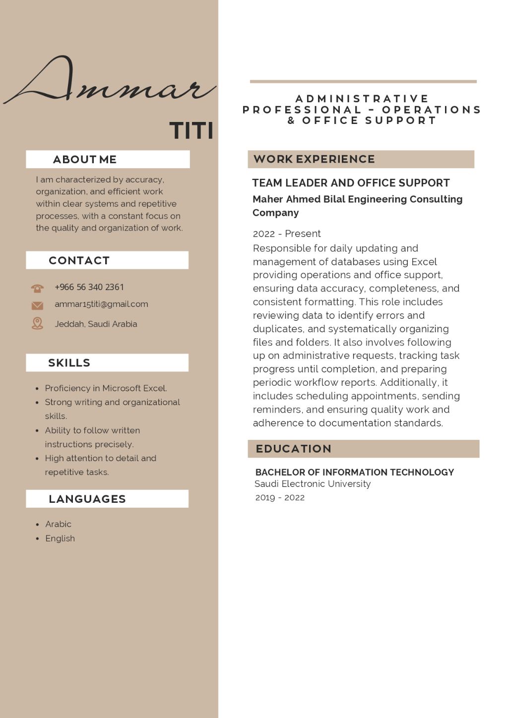 مساعد اداري محترف خبرة 5 سنين اسمي عمار وأنا اعمل كمساعد اداري محترف لدى مجموعة شركات ميسان للتطوير العقاري متابعة سير الأعمال، اعداد التقارير كتابة عقود العمل على الاكسل، وتنظيم المواعيد مع الالتزام بمعايير الجودة والتوثيق)