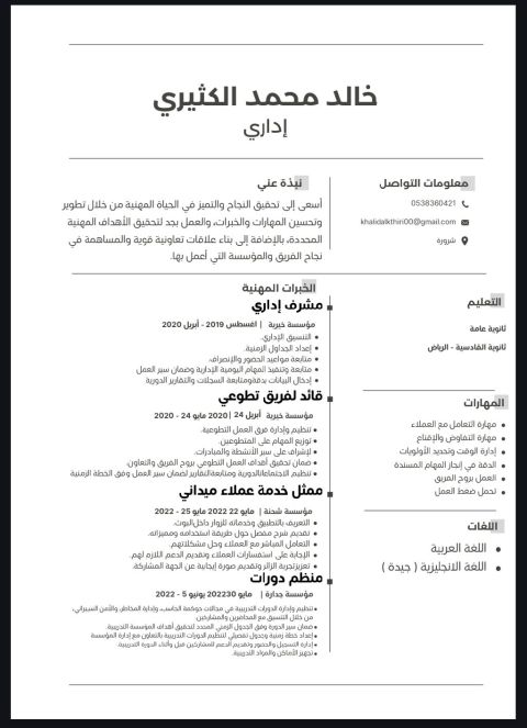 مشرف اداري مؤسسة خيرية. التنسيق الاداري. أغسطس 2019 - أبريل 2020. اعداد الجداول الزمنية. متابعة مواعيد الحضور والانصراف. متابعة وتنفيذ المهام اليومية الادارية وضمان سير العمل. ادخال البيانات بدقة ومتابعة السجلات والتقارير الدورية - قائد الفريق تطوعي مؤسسة خيرية أبريل 24 2020 مايو 24 - 2020. تنظيم وإدارة فرق العمل التطوعية. توزيع