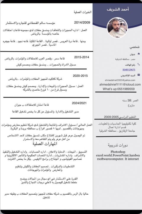 مدير تشغيل ومدير منطقة، خبرة بالمملكة 14 عام في مجال الضيافة والفنادق والمطاعم، عملت بكبرى الفنادق العالميه، انجليزيه ممتازة، مهارات قيادية وتخطيطيه، للتواصل والاطلاع على السي في والشهادات والدورات الرجاء التواصل على الرقم اتصال أو واتساب أو التواصل عن طريق البريد الألكتروني