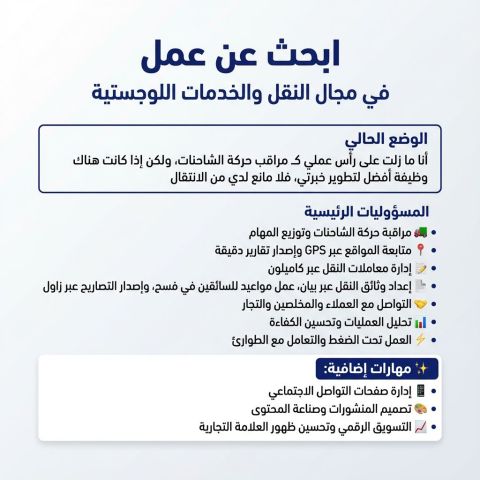 اعمل حاليا كمراقب حركة الشاحنات، أتابع المسارات وأوزع المهام، وأدير معاملات النقل عبر أنظمة آفاقي، كاميلون، بيان، فسح، زاول، وأتابع تقارير دقيقة يومية لضمان كفاءة التشغيل. كما امتلك مهارات اضافية في إدارة صفحات التواصل الاجتماعي، تصميم المنشورات وصناعة المحتوى، والتسويق الرقمي لتعزيز ظهور العلامة التجارية. أسعى لفرصة جديدة تمكنني من تطوير خبرتي والمساهمة في تحسين العمليات