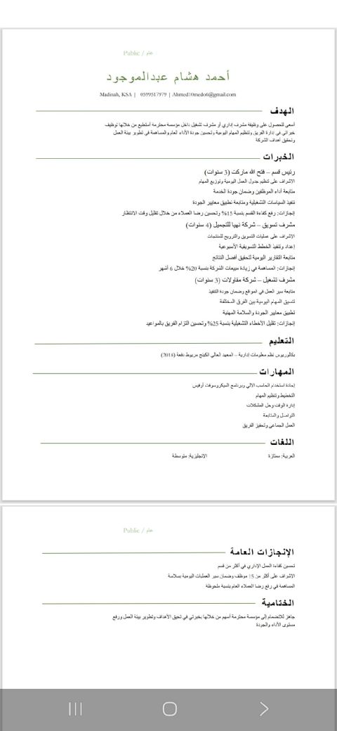 باحث عن عمل - مشرف تشغيل / مشرف مبيعات / مشرف اداري أنا شاب مصري مقيم حاليا في الرياض وابحث عن فرصة عمل مناسبة في أحد المجالات التالية مشرف تشغيل مشرف مبيعات مشرف اداري لدي خبرة أكثر من 10 سنوات في إدارة فرق العمل وتنظيم العمليات اليومية ومتابعة الأداء وتحسين جودة العمل، مع خبرة في مجالات المقاولات والتسويق وإدارة الأقسام. أبرز المهارات إدارة وتوجيه فريق العمل تنظيم جداول العمل والمهام اليومية