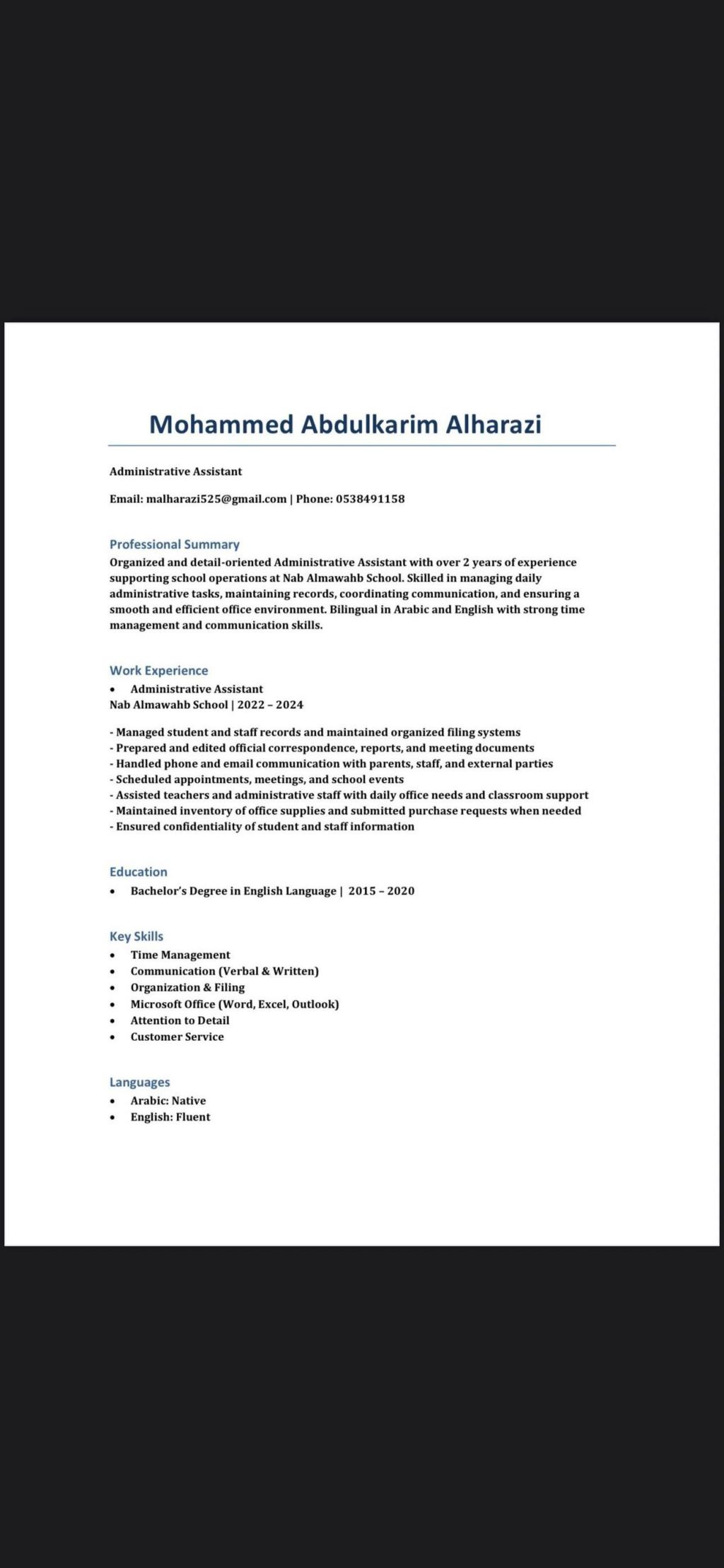 I am looking for an administrative job in any suitable field. I worked as an administrative assistant for two years and have experience in organization, multitasking, and effective communication I am a fast learner, adaptable to any work environment, and I enjoy structured work and completing tasks efficiently