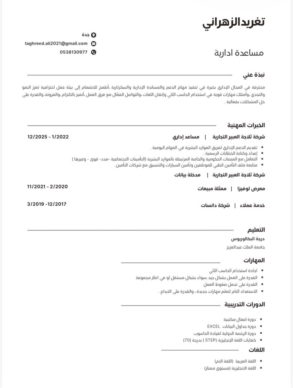 باحثة عن وظيفة مساعدة ادارية في جدة امتلك خبرة 4 سنوات في مجال الأعمال الادارية، تشمل التنسيق، وتنظيم الملفات، واعداد التقارير، والتعامل مع المراسلات الداخلية والخارجية. أتقن استخدام برامج مايكروسوفت أوفيس (Word - Excel - PowerPoint) وأجيد التواصل والعمل بروح الفريق. ابحث عن فرصة عمل مناسبة في بيئة مهنية مستقرة. للتواصل أو رقم