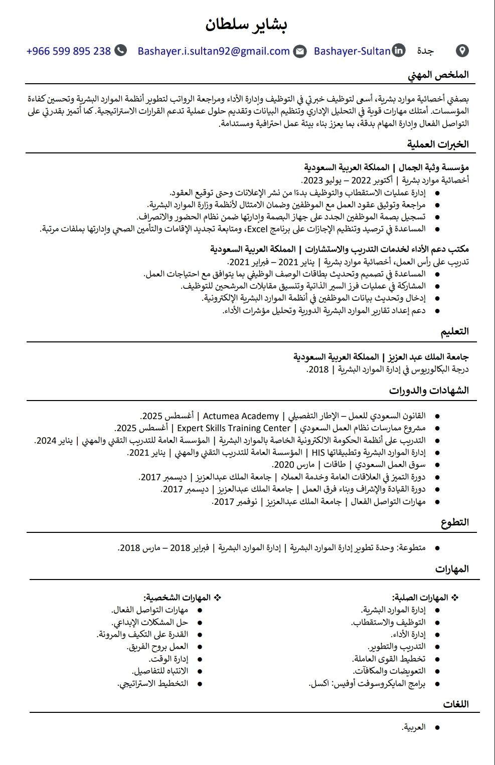 I am pleased to apply for your job opportunities. I am an HR Specialist from Jeddah with experience in recruitment, payroll, compliance with Saudi labor laws, and HR reporting. I also have strong knowledge of Saudi labor regulations and government e services. Please find my attached résumé