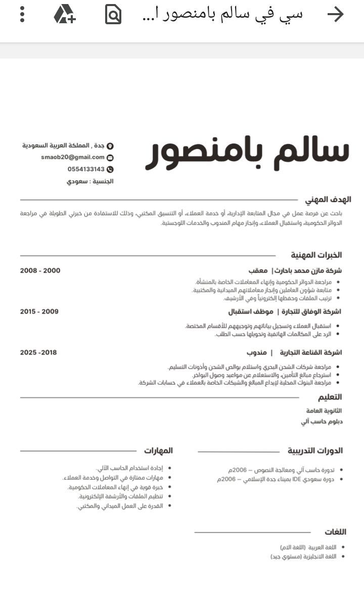 الخبرات المهنية عملت بوظيفة معقب وتتضمن المهام مراجعة الدوائر الحكوميه ومتابعه المعاملات التي تخص العاملين بالمنشأة ميدانيا ومكتبيا ترتيب الملفات وحفظها في الجهاز وأرشفتها وعملت أيضا موظف استقبال من حيث المهام استقبال العملاء وتدوين بياناتهم وتوجيههم الى القسم المختص والرد على المكالمات الهاتفية وتدوين استفساراتهم وتحويلهم للموظف المختص وعملت أيضا مندوب للشركة وتقتصر المهام الوظيفيه مراجعة البنوك