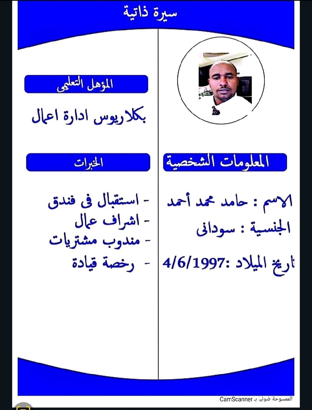 الاسم حامد محمد أحمد. الجنسية سوداني. أحتاج عمل في الاشراف ومتابعة العمال خبرة في الفنادق رفع مستوى النظافة ومتابعة الصيانة 5 سنوات والمقاولات 2 سنة