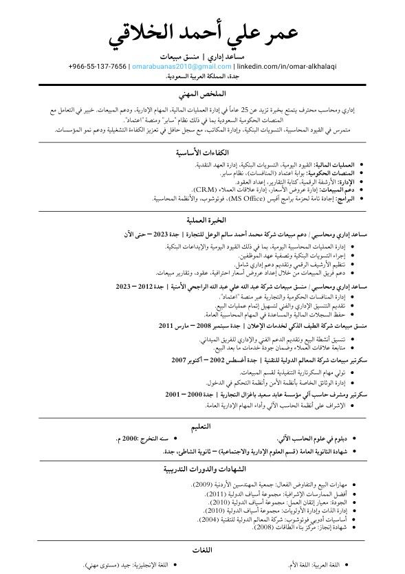 اداري ومساعد محاسب محترف يتمتع بخبرة تزيد عن 25 عاما في إدارة العمليات المالية، المهام اإلدارية، ودعم المبيعات. خبير في التعامل مع المنصات الحكومية السعودية بما في ذلك نظام "سابر" ومنصة "اعتماد" متمرس في القيود المحاسبية، التسويات البنكية، وإدارة المكاتب، مع سجل حافل في تعزيز الكفاءة التشغيلية ودعم نمو المؤسسات