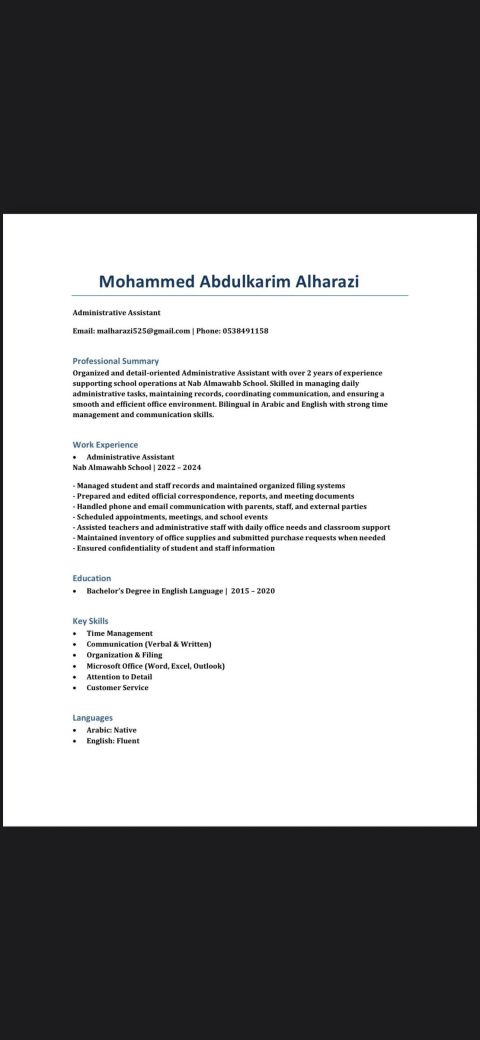 Looking for an administrative or secretary position with over 10 years of experience in translation, interpretation, administration, project management, and translation across Egypt, Kuwait, and Saudi Arabia. Proficient in English and experienced in using AI tools and automation to enhance performance and efficiency. Currently in Saudi Arabia and available to start immediately