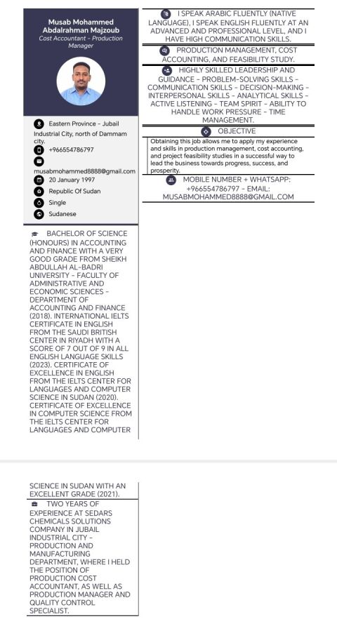 سوداني صاحب خبرات ومهارات في إدارة خطوط الانتاج في الشركات والمشاريع وحساب التكاليف ودراسة الجدوى وضبط الجودة ومتحدث للغة الانجليزية بطلاقة وبمستوى متقدم واحترافي