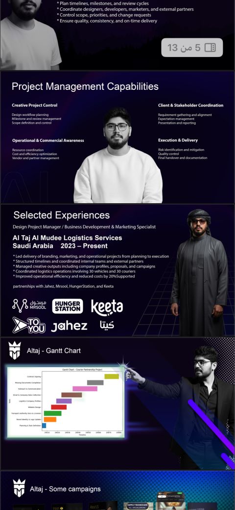 مدير مشاريع تصميم بخبرة تزيد عن 4 سنوات في تقديم مشاريع العلامات التجارية والرقمية والتشغيلية في المملكة العربية السعودية ومصر. يتمتع بخلفية قوية في هيكلة سير العمل الابداعي، وتنسيق الفرق متعددة الوظائف، وإدارة الجداول الزمنية والموارد، وترجمة متطلبات العمل الى نتائج تصميم قابلة للتنفيذ. لديه قدرة مثبتة على تحقيق التوازن بين الجودة الابداعية والقيود التجارية والتشغيلية