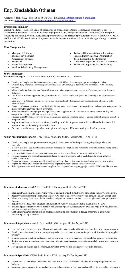 Sudanese National Procurement Manager with 16 years of experience in the Saudi market across various commercial sectors, including technology projects and general trading. Possesses expertise in developing procurement plans and establishing procurement procedures and policies. Holds a bachelor's degree in electrical and electronic engineering with honours and has exchas experience in importing