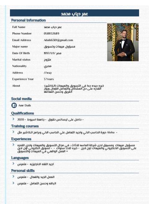 My name is Amr Diab Mohamed, I am 27 years old, and I hold a Master's degree in Law. I have experience in corporate management, I work well under pressure, and I am committed to continuous improvement. I also have over two years of experience in online marketing and sales. I am currently seeking employment