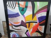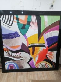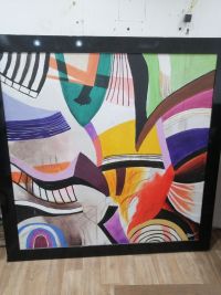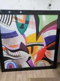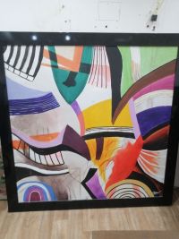 لوحة فنية بتصميم تجريدي عصري تجمع بين الالوان الجريئة والمتناسقة (الأصفر، البنفسجي، الأخضر، الأحمر، والأسود) تعطي لمسة فخامة وحيوية لأي مكان