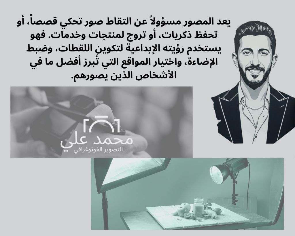 مصور فوتوجرافر خبرة 5 سنوات في تصوير الفيديو متخصص في تصوير المنتجات بشكل احترافي تصوير المؤتمرات والمشاريع الانشائية تصوير الحفلات أجيد اعداد الريلز وكتابة السكريبت خبرة في برامج premier - capcut لتوثيق اللحضات بأعلى جودة أسعار ترضي الجميع