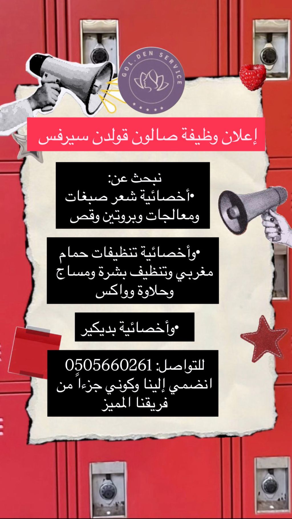 نبحث في صالون قولدن سرفيس للتزيين النسائي في جدة (قويزة - شارع جاك - أبرق الرغامة) عن أخصائية شعر شاملة (قص، بروتين، صبغات، بوتكس) أخصائية تنظيفات (تنظيف بشرة، حمام مغربي، مساج، واكس وحلاوة) أخصائية بديكير فلبينية متخصصة. يشترط الخبرة والكفاءة. للتواصل عبر زيارة الصالون بالموقع المذكور