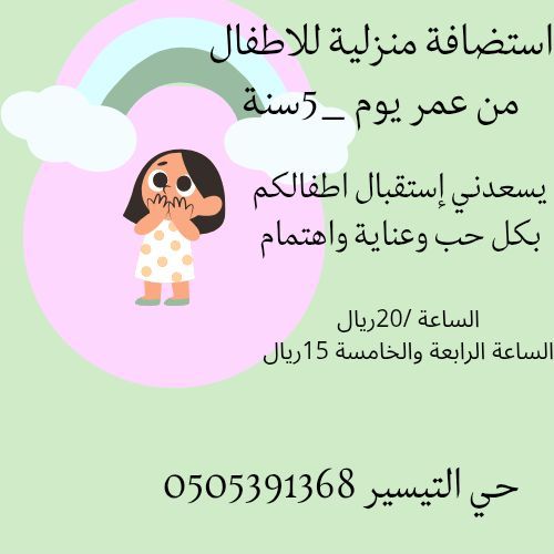 استضافة منزلية للاطفال جدة / حي التيسير سودانية بحي التيسير يسعدني استضافة اطفالكم بكل حب وعناية واهتمام للاطفال من عمر يوم الى 5 سنة اححب الاطفال وأخاف الله فيهم وأعرف أتعامل معاهم بكل حنية وحب خلي طفلك معيا وانتي مطمنة الساعة علي 15 ريال الخامسة والسادسة 10 ريال حياكم دوام مسائي أو صباحي