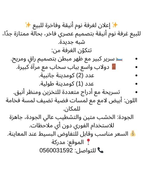 للبيع غرفة نوم أنيقة بتصميم عصري فاخر، بحالة ممتازة جدا، شبه جديدة. تتكون الغرفة من سرير كبير مع ظهر مبطن بتصميم راق ومريح دولاب واسع بباب سحاب مع مرآة كبيرة عدد (2) كومدينة جانبية عدد (1) كومدينة طولية تسريحة مع أدراج متعددة للتخزين ومنظر أنيق اللون أبيض لامع مع لمسات فضية تضيف لمسة فخامة للمكان. الخشب متين والتشطيب عالي الجودة، جاهزة للاستخدام الفوري دون أي ملاحظات. السعر مناسب وقابل للتفاوض البسيط