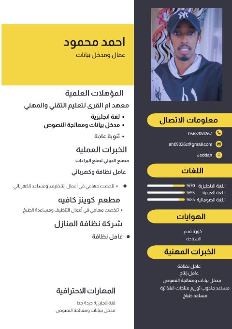 اسمي أحمد محمود أحمد. الجنسية صومالي العمر 31 سنة مقيم حاليا في مدينة جدة تحديدا حي البستان ابرغ الرغامة حاليا أنا عاطل عن العمل وابحث عن أي عمل أتحدث اللغة العربية بطلاقة وعندي لغة انجليزية جيدة جدا وعندي خبرة قليلة في برنامج اكسل وبرامج مايكروسوفت أوفيس حاسب آلي. الى حابب يتواصل معي