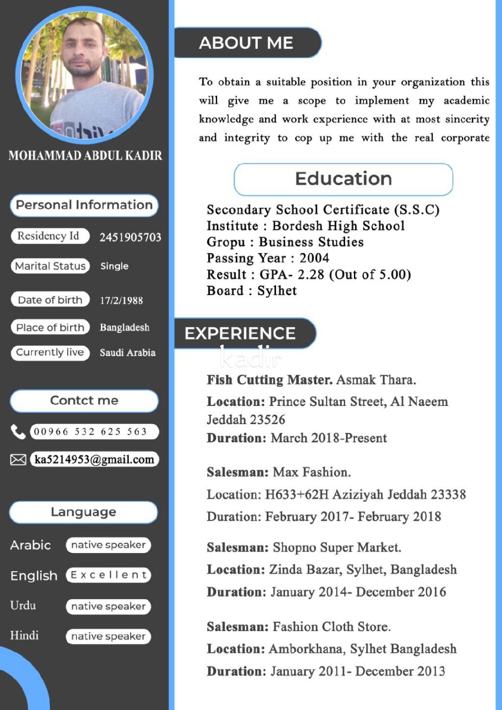 I am looking for a job I know how to cut fish I have 7 years experience in cutting fish I have two years experience working in a cloth shop I have no date for 2 months Baldia Ghat no date card can contact me on this