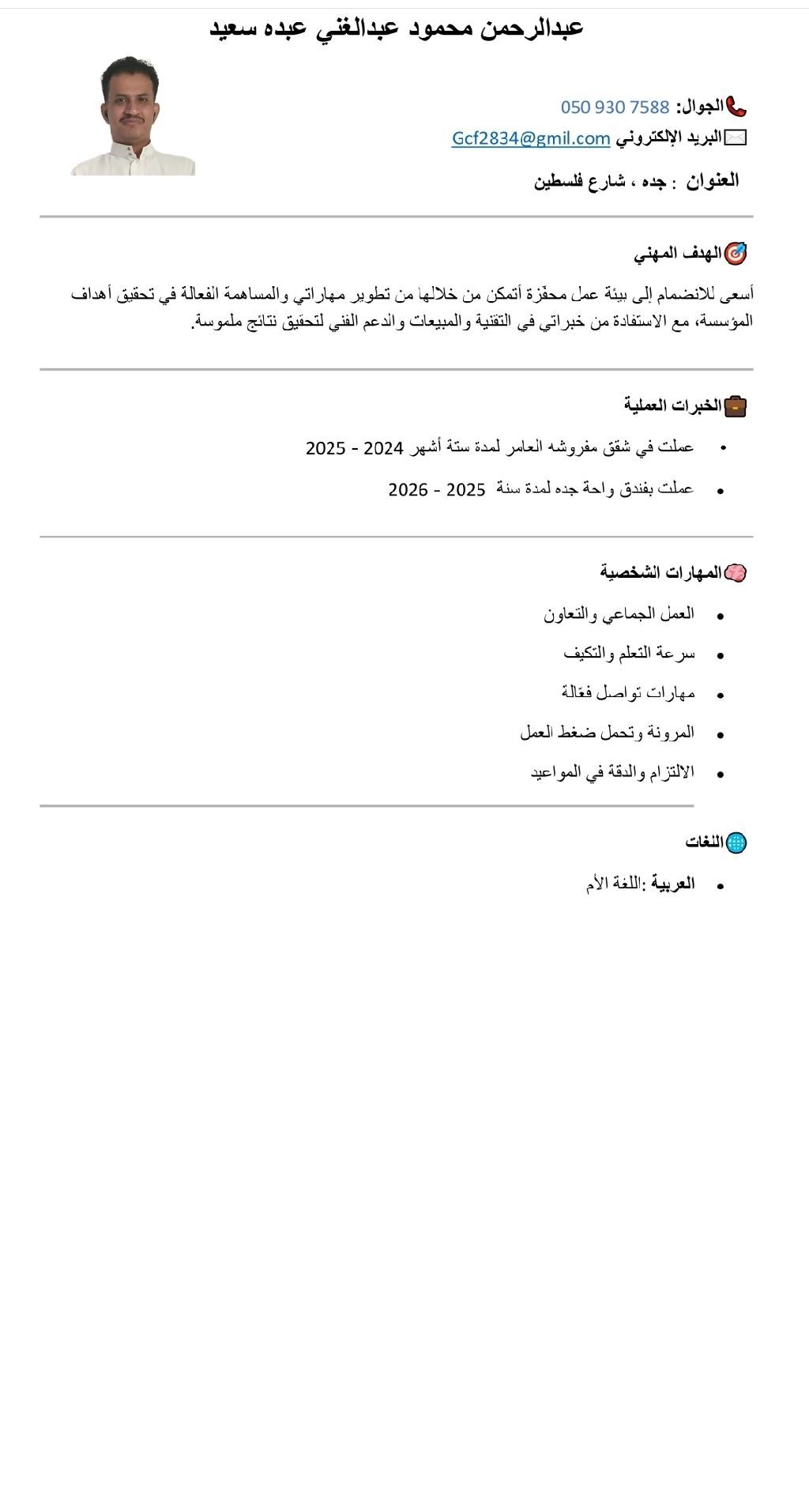 خدمة شقق مفروشه أو حراسة خبرة سنة في مجال الشقق المفروشه