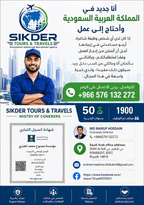 There are jobs for coffee moallem, cleaners, residential hotels, restaurants, airports, burger shops, supermarkets, car washes, construction, road cleaners, garden cleaners, madrasa cleaners, catering, car drivers, restaurant waiters, electricians, plumbers, motorcycle drivers, and more. If you need people, contact me - Mostafa