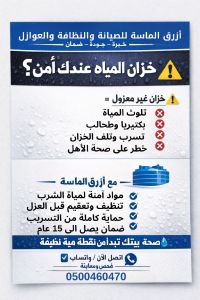 شركة عزل خزانات - خزان بيتك مهدد بالتسريب أو التلوث حرارة جدة والرطوبة ممكن تسبب تشققات وتسريب في الخزانات الخرسانية لا تخاطر بصحة أسرتك وفر حماية كاملة لخزانك مع عزل احترافي بضمان حقيقي يصل الى 10 سنوات. نقدم لكم في جدة عزل خزانات أرضية وعلوية عزل إيبوكسي معتمد وآمن لمياه الشرب معالجة الشروخ والتسريبات قبل العزل اختبار تعبئة وضمان 15 سنة