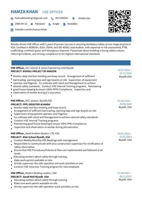أنا موظف سلامة وصحة مهنية (HSE Officer) بخبرة 5 سنوات. كان آخر مشروعي مع أمازون، وأنا متاح للبدء فورا. لدي اقامة صالحة