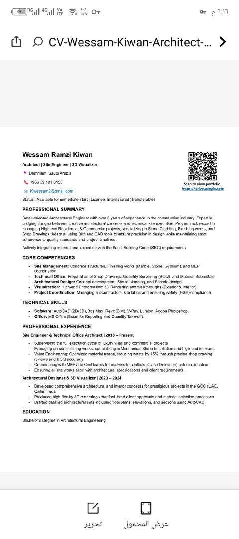 مهندس معماري خبرة 8 سنوات في متابعة الأعمال الميدانية والاشراف على التنفيذ، ومتمكن من التصميم المعماري. ابحث عن فرصة عمل في الدمام أو المنطقة الشرقية، وجاهز فورا للعمل. امتلك رخصة قيادة